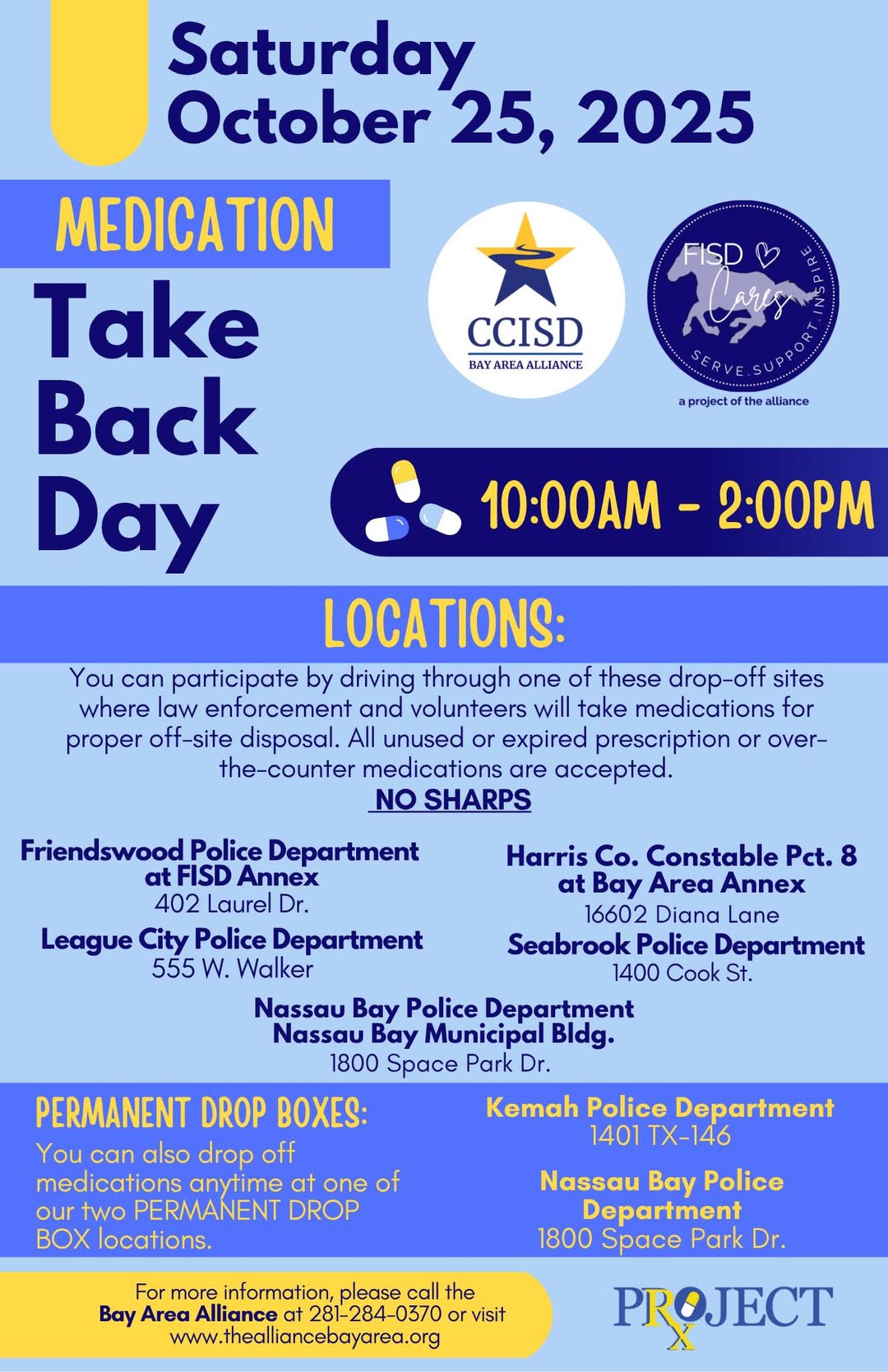 The event will take place at the Friendswood ISD Annex located at π402 Laurel Drive, from 10 AM β 2 PM. Residents can participate in the by driving through the drop-off site where law enforcement will take medications for proper off-site disposal.